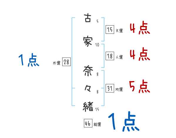 外運![]() | 古家奈々緒さんの外運は28画の1つ星!家庭環境に注意。スポーツで活躍できる能力があるかも。 生活面を象徴する運勢です。外部から受ける影響力を表し、結婚運、家庭運や職場、環境への順応性を表します。 |