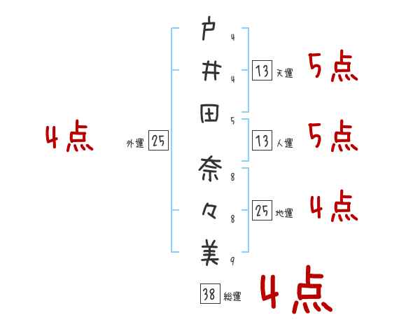 天運![]() | 戸井田奈々美さんの天運は13画の5つ星!才能に恵まれ人気がある。名声を手に入れる。円満な人生。 家系が持つ宿命的な運勢を表します。祖先から受け継いだ苗字ですので自分の力が及びません。家柄を象徴します。 |