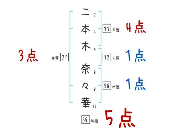 総運![]() | 二本木奈々華さんの総運は39画の5つ星!社交性に優れ人望が厚い。人の上に立ち成功する。 あなたの人生を表す1番重要な運勢です。生涯を通じて影響する総合運となり、主に50歳以降の晩年期に影響を及ぼします。 |