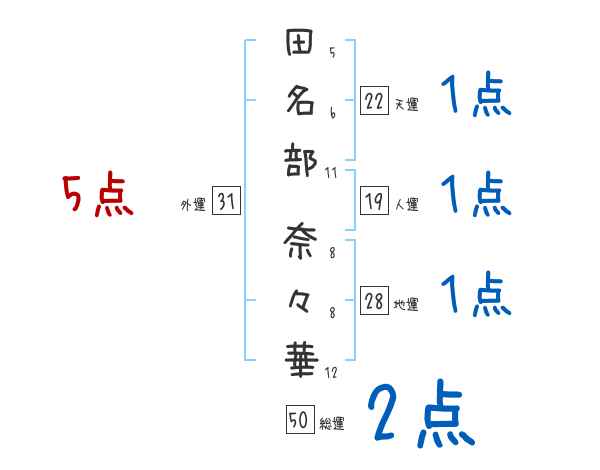 天運![]() | 田名部奈々華さんの天運は22画の1つ星!努力することが苦手ないっぽう手先が器用。芸術性にも優れる。 家系が持つ宿命的な運勢を表します。祖先から受け継いだ苗字ですので自分の力が及びません。家柄を象徴します。 |