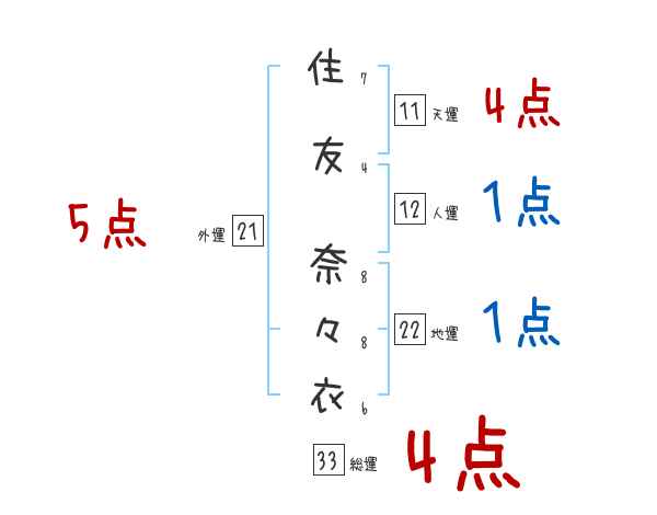 外運![]() | 住友奈々衣さんの外運は21画の5つ星!統率力がある。独立し成功する。名誉を手に入れる。 生活面を象徴する運勢です。外部から受ける影響力を表し、結婚運、家庭運や職場、環境への順応性を表します。 |