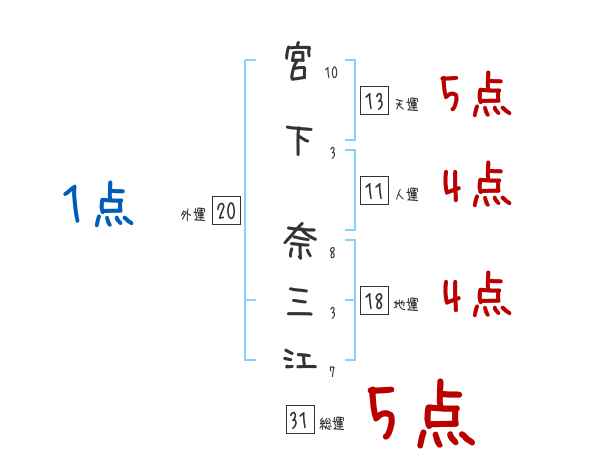 天運![]() | 宮下奈三江さんの天運は13画の5つ星!才能に恵まれ人気がある。名声を手に入れる。円満な人生。 家系が持つ宿命的な運勢を表します。祖先から受け継いだ苗字ですので自分の力が及びません。家柄を象徴します。 |