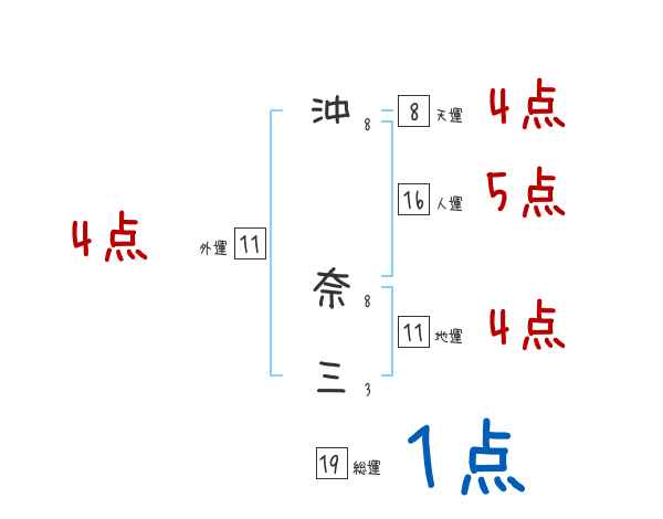 天運![]() | 沖奈三さんの天運は8画の4つ星!勤勉家。根気強く努力し成功する。忍耐力がある。 家系が持つ宿命的な運勢を表します。祖先から受け継いだ苗字ですので自分の力が及びません。家柄を象徴します。 |