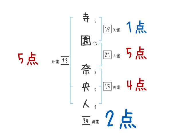 総運![]() | 寺園奈央人さんの総運は34画の2つ星!独創性に優れるが、自尊心が強く災難に注意しましょう。 あなたの人生を表す1番重要な運勢です。生涯を通じて影響する総合運となり、主に50歳以降の晩年期に影響を及ぼします。 |