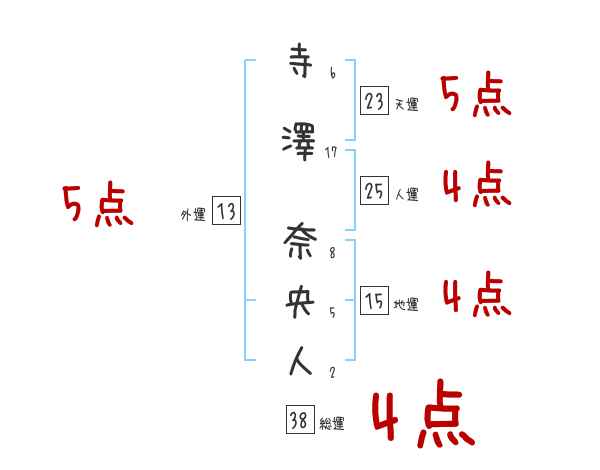 天運![]() | 寺澤奈央人さんの天運は23画の5つ星!想像力に優れ活力がある。一代で成功し名誉を手に入れる。 家系が持つ宿命的な運勢を表します。祖先から受け継いだ苗字ですので自分の力が及びません。家柄を象徴します。 |