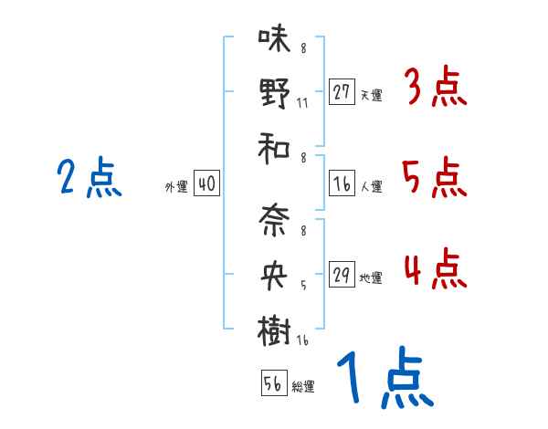 人運![]() | 味野和奈央樹さんの人運は16画の5つ星!人望が厚く大きく発展する。逆転成功が見える。 性格や才能などを表す2番目に重要な運勢です。人間関係や協調性、社会的な成功に影響します。主に20歳から50歳ぐらいまでの中年期の運勢を表します。 |