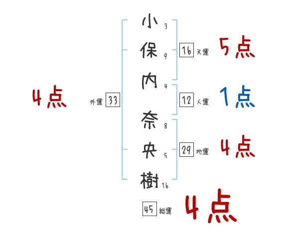 外運![]() | 小保内奈央樹さんの外運は33画の4つ星!権力志向でプライドが高い。勇気があり運を切り開き成功する。 生活面を象徴する運勢です。外部から受ける影響力を表し、結婚運、家庭運や職場、環境への順応性を表します。 |