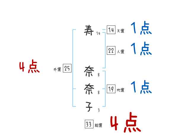 天運![]() | 寿奈奈子さんの天運は14画の1つ星!人に対して優しいがストレスを溜め込みがち。人間関係のトラブルを避けるよう気をつけましょう。 家系が持つ宿命的な運勢を表します。祖先から受け継いだ苗字ですので自分の力が及びません。家柄を象徴します。 |