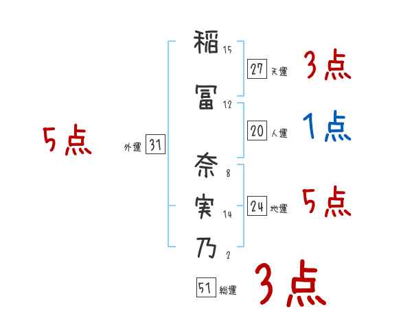 総運![]() | 稲冨奈実乃さんの総運は51画の3つ星!変化が激しく、危険に注意。堅実な性格。 あなたの人生を表す1番重要な運勢です。生涯を通じて影響する総合運となり、主に50歳以降の晩年期に影響を及ぼします。 |