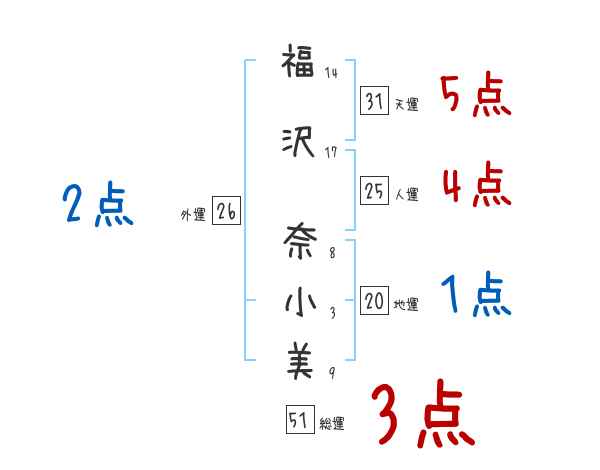 総運![]() | 福沢奈小美さんの総運は51画の3つ星!変化が激しく、危険に注意。堅実な性格。 あなたの人生を表す1番重要な運勢です。生涯を通じて影響する総合運となり、主に50歳以降の晩年期に影響を及ぼします。 |