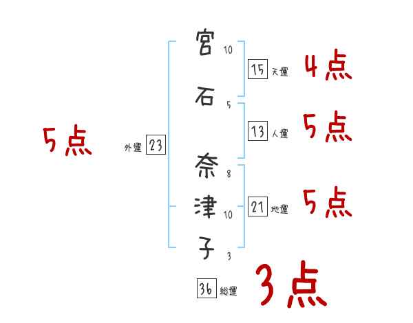 総運![]() | 宮石奈津子さんの総運は36画の3つ星!先見性が豊かです。多少神経質で苦労することも。 あなたの人生を表す1番重要な運勢です。生涯を通じて影響する総合運となり、主に50歳以降の晩年期に影響を及ぼします。 |