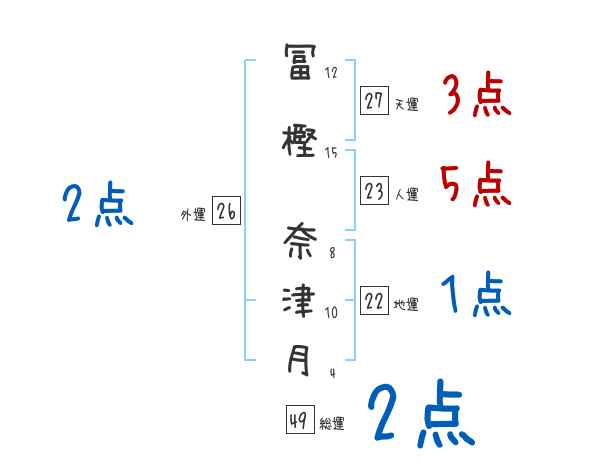 天運![]() | 冨樫奈津月さんの天運は27画の3つ星!頭脳明晰だが強情で摩擦が多い傾向。孤立に注意。 家系が持つ宿命的な運勢を表します。祖先から受け継いだ苗字ですので自分の力が及びません。家柄を象徴します。 |