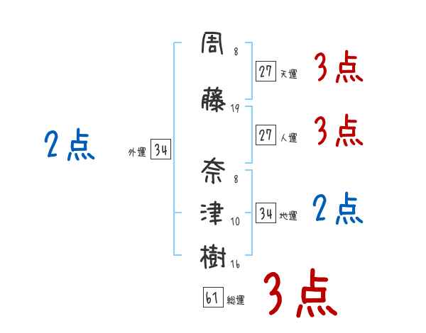 | 外運  | 周藤奈津樹さんの外運は34画の2つ星!独創性に優れるが、自尊心が強く災難に注意しましょう。生活面を象徴する運勢です。外部から受ける影響力を表し、結婚運、家庭運や職場、環境への順応性を表します。 |
