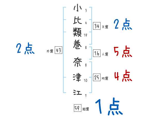 人運![]() | 小比類巻奈津江さんの人運は16画の5つ星!人望が厚く大きく発展する。逆転成功が見える。 性格や才能などを表す2番目に重要な運勢です。人間関係や協調性、社会的な成功に影響します。主に20歳から50歳ぐらいまでの中年期の運勢を表します。 |