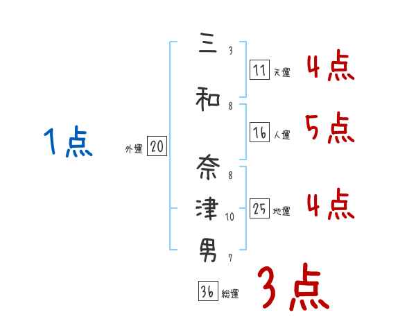 人運![]() | 三和奈津男さんの人運は16画の5つ星!人望が厚く大きく発展する。逆転成功が見える。 性格や才能などを表す2番目に重要な運勢です。人間関係や協調性、社会的な成功に影響します。主に20歳から50歳ぐらいまでの中年期の運勢を表します。 |