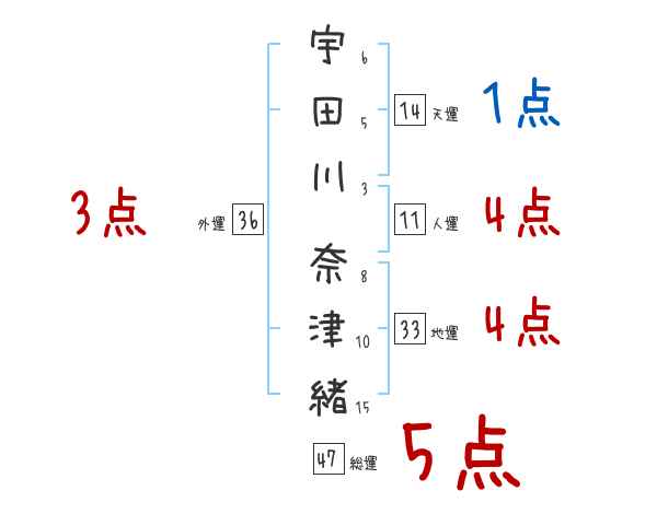 総運![]() | 宇田川奈津緒さんの総運は47画の5つ星!実力が開花し発展する円満な人生。財に恵まれる。 あなたの人生を表す1番重要な運勢です。生涯を通じて影響する総合運となり、主に50歳以降の晩年期に影響を及ぼします。 |