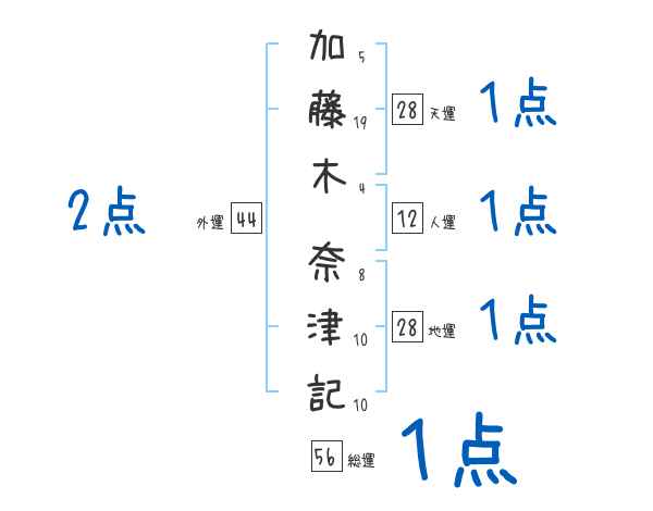 天運![]() | 加藤木奈津記さんの天運は28画の1つ星!家庭環境に注意。スポーツで活躍できる能力があるかも。 家系が持つ宿命的な運勢を表します。祖先から受け継いだ苗字ですので自分の力が及びません。家柄を象徴します。 |