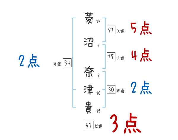 天運![]() | 菱沼奈津貴さんの天運は21画の5つ星!統率力がある。独立し成功する。名誉を手に入れる。 家系が持つ宿命的な運勢を表します。祖先から受け継いだ苗字ですので自分の力が及びません。家柄を象徴します。 |