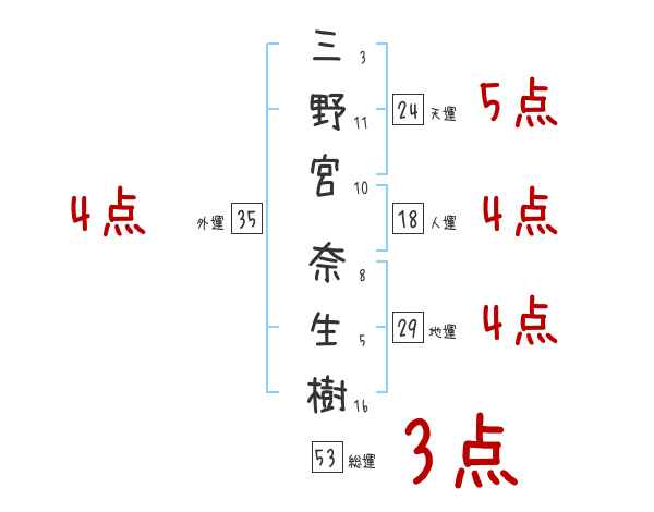天運![]() | 三野宮奈生樹さんの天運は24画の5つ星!家庭運が良く順調な人生。金運にも恵まれる。 家系が持つ宿命的な運勢を表します。祖先から受け継いだ苗字ですので自分の力が及びません。家柄を象徴します。 |
