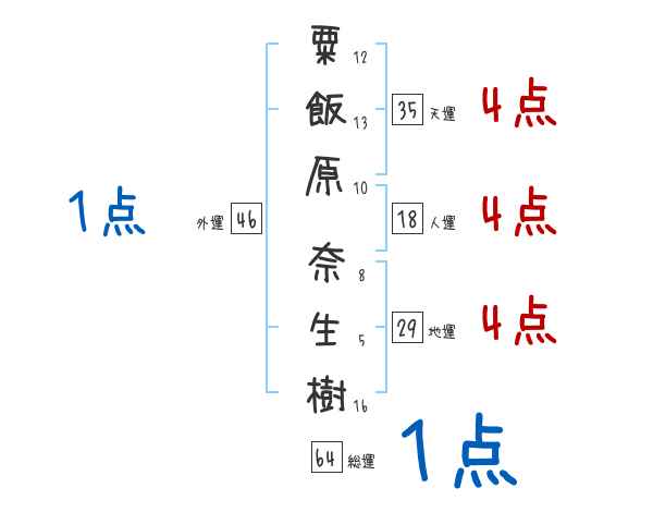 地運![]() | 粟飯原奈生樹さんの地運は29画の4つ星!完全主義で才能がある。厳格な心の持ち主。 個性を表す基礎的な運勢です。性格形成や対人関係、行動力など家庭環境に影響されます。主に誕生してから20歳くらいまでの若年期の運勢を表します。 |
