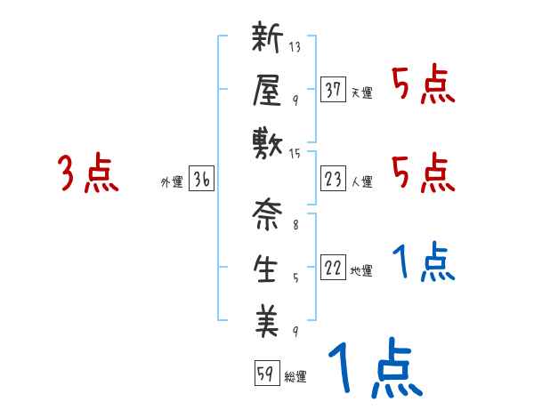 外運![]() | 新屋敷奈生美さんの外運は36画の3つ星!先見性が豊かです。多少神経質で苦労することも。 生活面を象徴する運勢です。外部から受ける影響力を表し、結婚運、家庭運や職場、環境への順応性を表します。 |