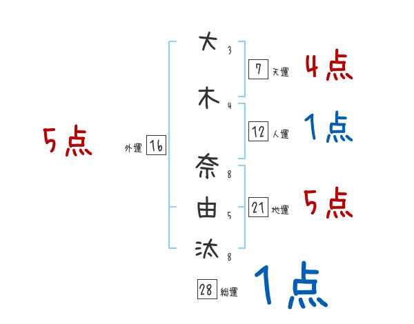 天運![]() | 大木奈由汰さんの天運は7画の4つ星!強い意志や信念を持ち独立心が強い。自立する。 家系が持つ宿命的な運勢を表します。祖先から受け継いだ苗字ですので自分の力が及びません。家柄を象徴します。 |
