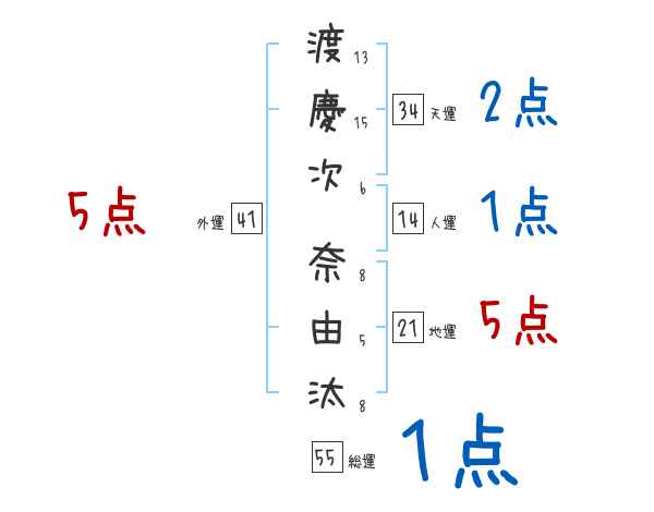 総運![]() | 渡慶次奈由汰さんの総運は55画の1つ星!欲張りな性格で軽率な行動に注意しましょう。病気に気をつけて。 あなたの人生を表す1番重要な運勢です。生涯を通じて影響する総合運となり、主に50歳以降の晩年期に影響を及ぼします。 |