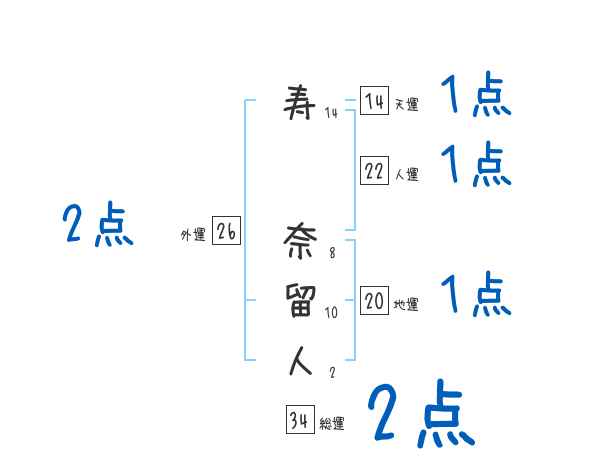 天運![]() | 寿奈留人さんの天運は14画の1つ星!人に対して優しいがストレスを溜め込みがち。人間関係のトラブルを避けるよう気をつけましょう。 家系が持つ宿命的な運勢を表します。祖先から受け継いだ苗字ですので自分の力が及びません。家柄を象徴します。 |
