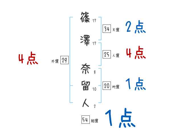 外運![]() | 篠澤奈留人さんの外運は29画の4つ星!完全主義で才能がある。厳格な心の持ち主。 生活面を象徴する運勢です。外部から受ける影響力を表し、結婚運、家庭運や職場、環境への順応性を表します。 |