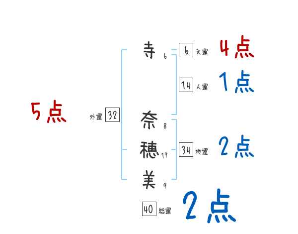 外運![]() | 寺奈穂美さんの外運は32画の5つ星!柔軟性があり成功する。チャンスが多く金運が良い。 生活面を象徴する運勢です。外部から受ける影響力を表し、結婚運、家庭運や職場、環境への順応性を表します。 |