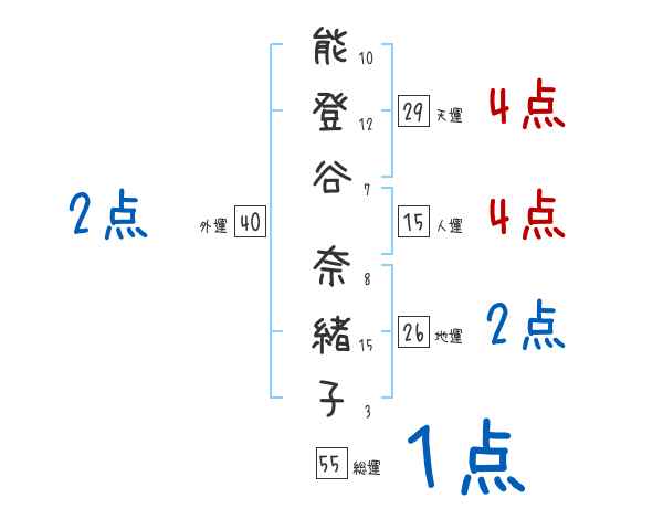 天運![]() | 能登谷奈緒子さんの天運は29画の4つ星!完全主義で才能がある。厳格な心の持ち主。 家系が持つ宿命的な運勢を表します。祖先から受け継いだ苗字ですので自分の力が及びません。家柄を象徴します。 |