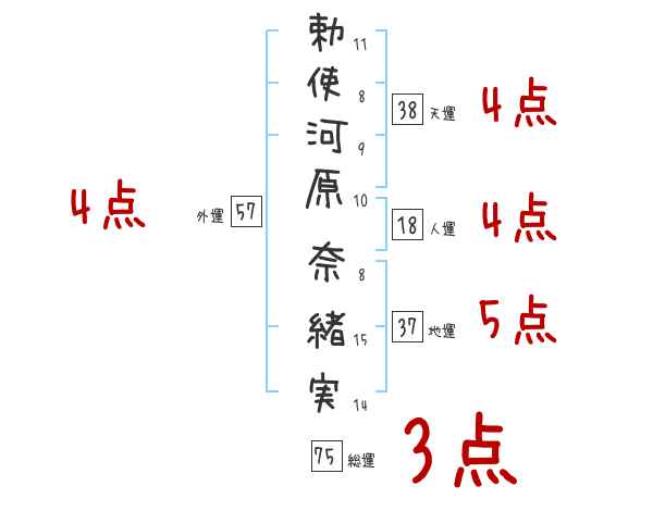 地運![]() | 勅使河原奈緒実さんの地運は37画の5つ星!努力家で順応性に優れる。現実的な考え方ができ忠実に物事をこなす。 個性を表す基礎的な運勢です。性格形成や対人関係、行動力など家庭環境に影響されます。主に誕生してから20歳くらいまでの若年期の運勢を表します。 |