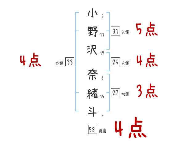 外運![]() | 小野沢奈緒斗さんの外運は33画の4つ星!権力志向でプライドが高い。勇気があり運を切り開き成功する。 生活面を象徴する運勢です。外部から受ける影響力を表し、結婚運、家庭運や職場、環境への順応性を表します。 |