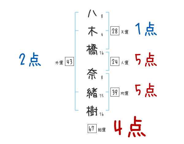 外運![]() | 八木橋奈緒樹さんの外運は43画の2つ星!頑固な性格で独立心が強いかも。やや非現実的で浪費に注意しましょう。 生活面を象徴する運勢です。外部から受ける影響力を表し、結婚運、家庭運や職場、環境への順応性を表します。 |