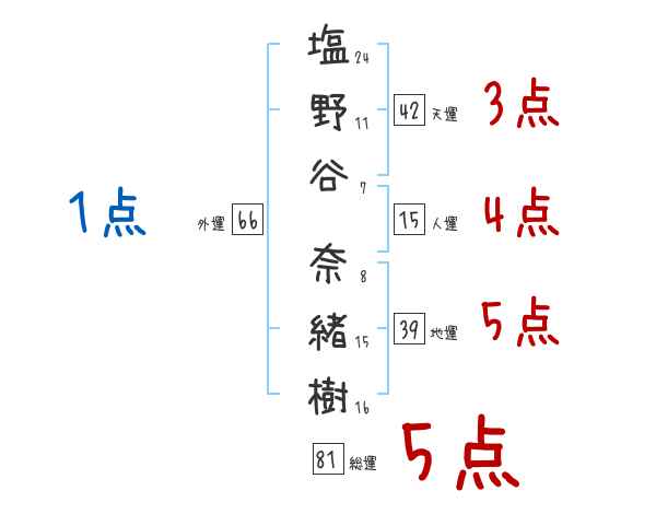 塩野谷奈緒樹さんの画数の鑑定結果