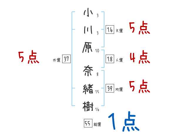 天運![]() | 小川原奈緒樹さんの天運は16画の5つ星!人望が厚く大きく発展する。逆転成功が見える。 家系が持つ宿命的な運勢を表します。祖先から受け継いだ苗字ですので自分の力が及びません。家柄を象徴します。 |