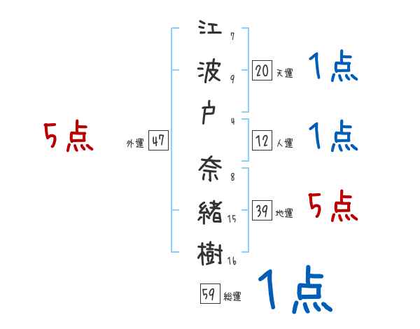 外運![]() | 江波戸奈緒樹さんの外運は47画の5つ星!実力が開花し発展する円満な人生。財に恵まれる。 生活面を象徴する運勢です。外部から受ける影響力を表し、結婚運、家庭運や職場、環境への順応性を表します。 |