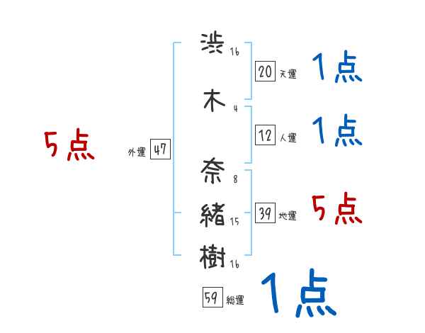 外運![]() | 渋木奈緒樹さんの外運は47画の5つ星!実力が開花し発展する円満な人生。財に恵まれる。 生活面を象徴する運勢です。外部から受ける影響力を表し、結婚運、家庭運や職場、環境への順応性を表します。 |