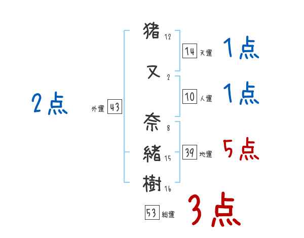 猪又奈緒樹さんの画数の鑑定結果