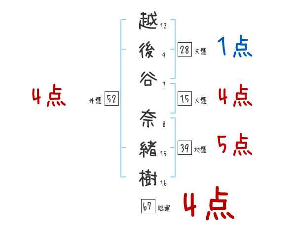 外運![]() | 越後谷奈緒樹さんの外運は52画の4つ星!先見性と独創性に優れ考える力がある。強運の持ち主。 生活面を象徴する運勢です。外部から受ける影響力を表し、結婚運、家庭運や職場、環境への順応性を表します。 |