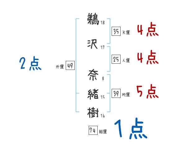 総運![]() | 鵜沢奈緒樹さんの総運は74画の1つ星!無気力で怠惰な生活送りがち。規則正しい生活を送るよう気をつけましょう。 あなたの人生を表す1番重要な運勢です。生涯を通じて影響する総合運となり、主に50歳以降の晩年期に影響を及ぼします。 |