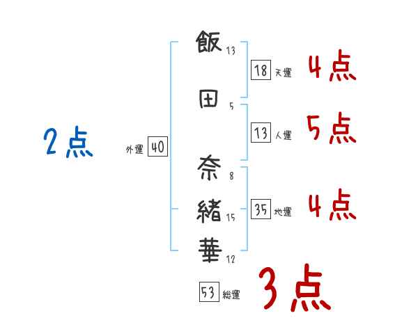 総運![]() | 飯田奈緒華さんの総運は53画の3つ星!やや見栄っ張りで虚栄心がある。散財に注意。 あなたの人生を表す1番重要な運勢です。生涯を通じて影響する総合運となり、主に50歳以降の晩年期に影響を及ぼします。 |