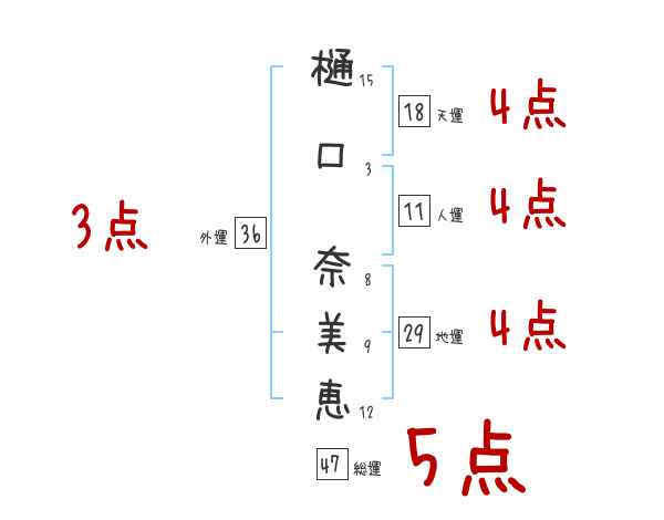 外運![]() | 樋口奈美恵さんの外運は36画の3つ星!先見性が豊かです。多少神経質で苦労することも。 生活面を象徴する運勢です。外部から受ける影響力を表し、結婚運、家庭運や職場、環境への順応性を表します。 |