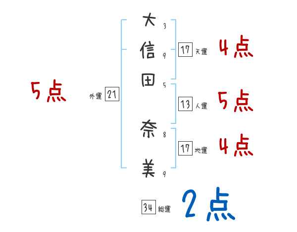天運![]() | 大信田奈美さんの天運は17画の4つ星!積極的な行動力。地位を気づき財産を手に入れる。純粋な心と直感力。 家系が持つ宿命的な運勢を表します。祖先から受け継いだ苗字ですので自分の力が及びません。家柄を象徴します。 |