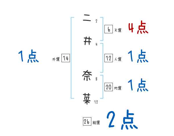 外運![]() | 二井奈菜さんの外運は14画の1つ星!人に対して優しいがストレスを溜め込みがち。人間関係のトラブルを避けるよう気をつけましょう。 生活面を象徴する運勢です。外部から受ける影響力を表し、結婚運、家庭運や職場、環境への順応性を表します。 |