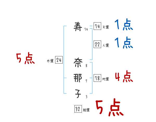 総運![]() | 寿奈那子さんの総運は32画の5つ星!柔軟性があり成功する。チャンスが多く金運が良い。 あなたの人生を表す1番重要な運勢です。生涯を通じて影響する総合運となり、主に50歳以降の晩年期に影響を及ぼします。 |