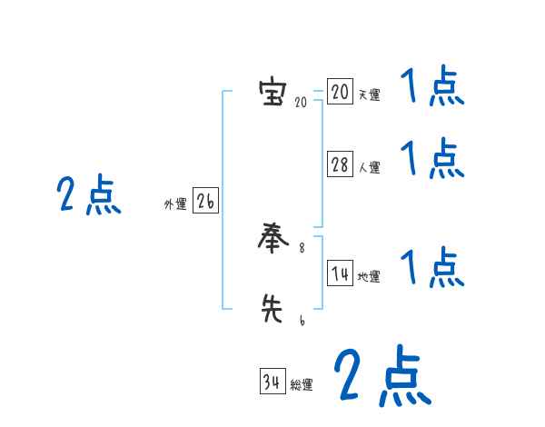 総運![]() | 宝奉先さんの総運は34画の2つ星!独創性に優れるが、自尊心が強く災難に注意しましょう。 あなたの人生を表す1番重要な運勢です。生涯を通じて影響する総合運となり、主に50歳以降の晩年期に影響を及ぼします。 |
