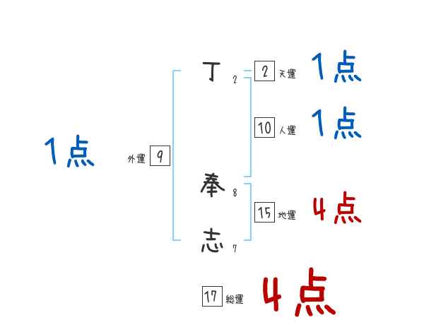 外運![]() | 丁奉志さんの外運は9画の1つ星!消極的で才能を発揮することが苦手なことも。周りの意見に耳を傾けましょう。 生活面を象徴する運勢です。外部から受ける影響力を表し、結婚運、家庭運や職場、環境への順応性を表します。 |