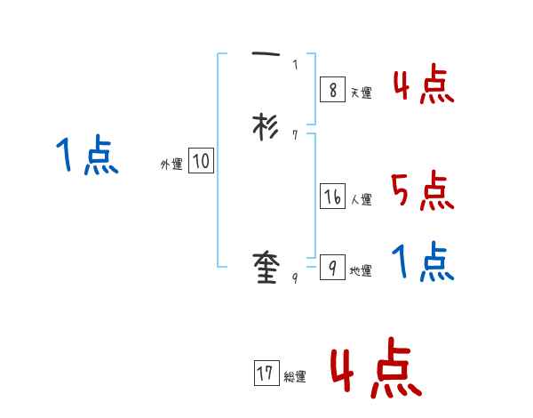 外運![]() | 一杉奎さんの外運は10画の1つ星!不安を感じやすい傾向。ストレスを抱えないように注意しましょう。 生活面を象徴する運勢です。外部から受ける影響力を表し、結婚運、家庭運や職場、環境への順応性を表します。 |