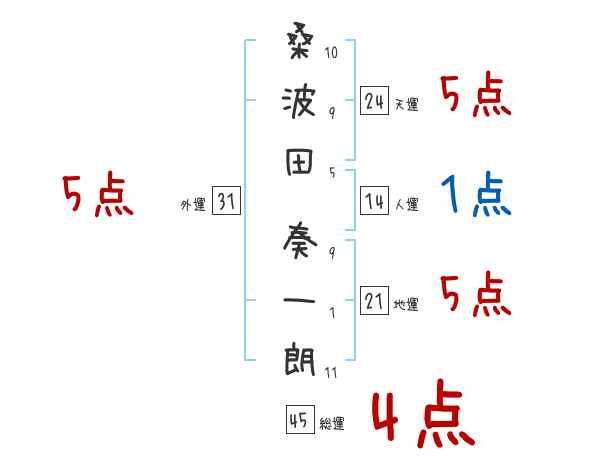 天運![]() | 桑波田奏一朗さんの天運は24画の5つ星!家庭運が良く順調な人生。金運にも恵まれる。 家系が持つ宿命的な運勢を表します。祖先から受け継いだ苗字ですので自分の力が及びません。家柄を象徴します。 |